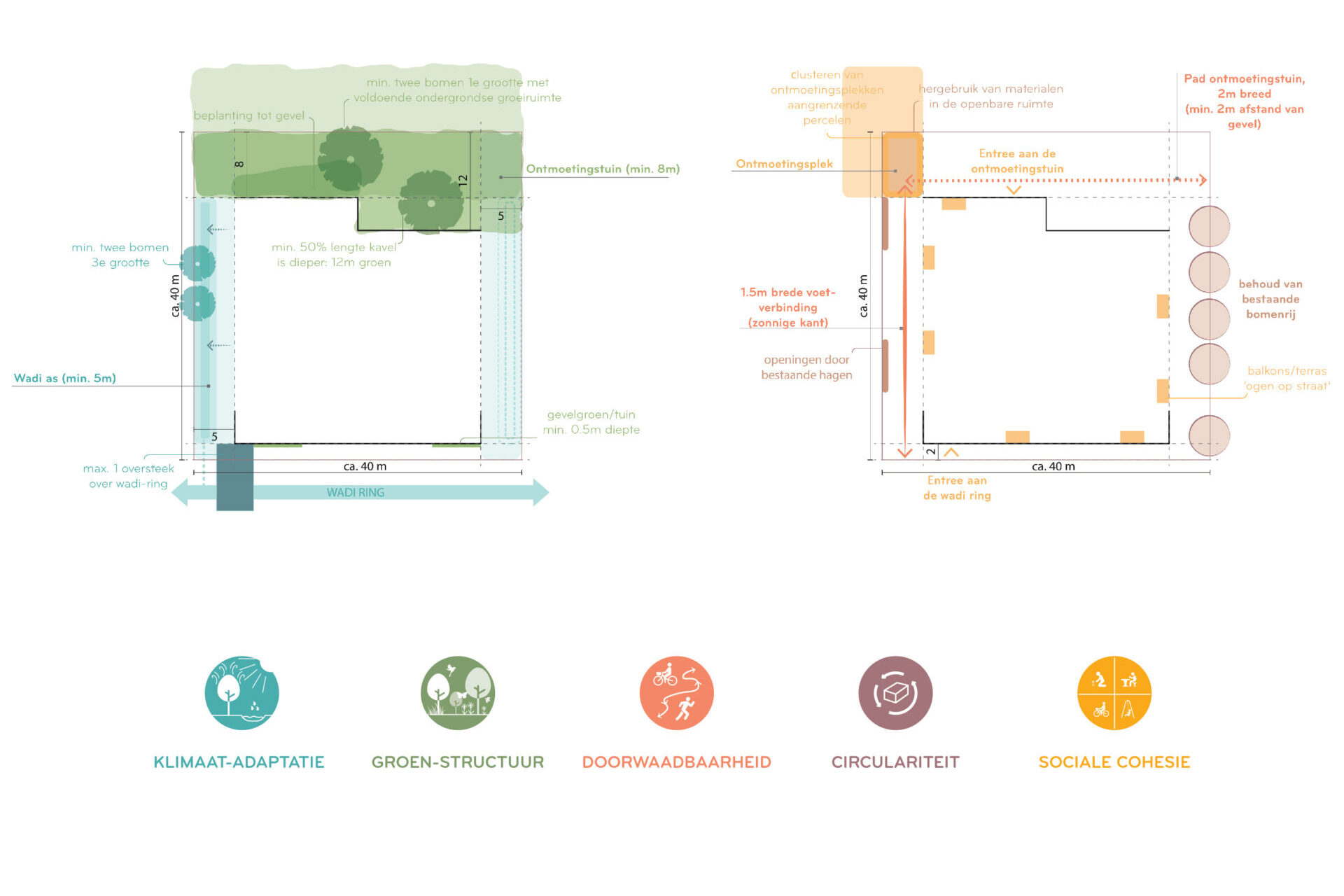 De volgende laag verbindt deze structuren met de afzonderlijke kavels: de vergroende Regulierenring – hernoemd tot de Wadi-ring – en het nieuwe centrale park. Tot slot vormt het groen binnen de kavels zelf collectief groen — de verbindende schakel tussen de grootschalige groenstructuren en het groen dicht bij de woningen. Deze gezamenlijke ruimtes stimuleren ontmoeting, vergroten de doorwaadbaarheid van het gebied en versterken de koppeling met het watersysteem.
