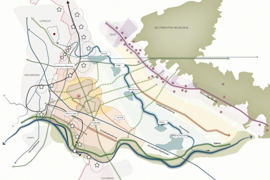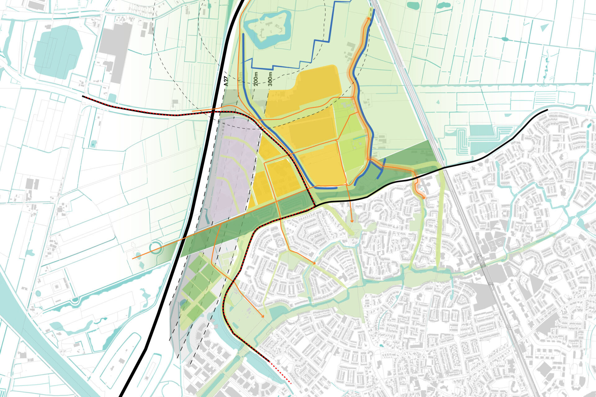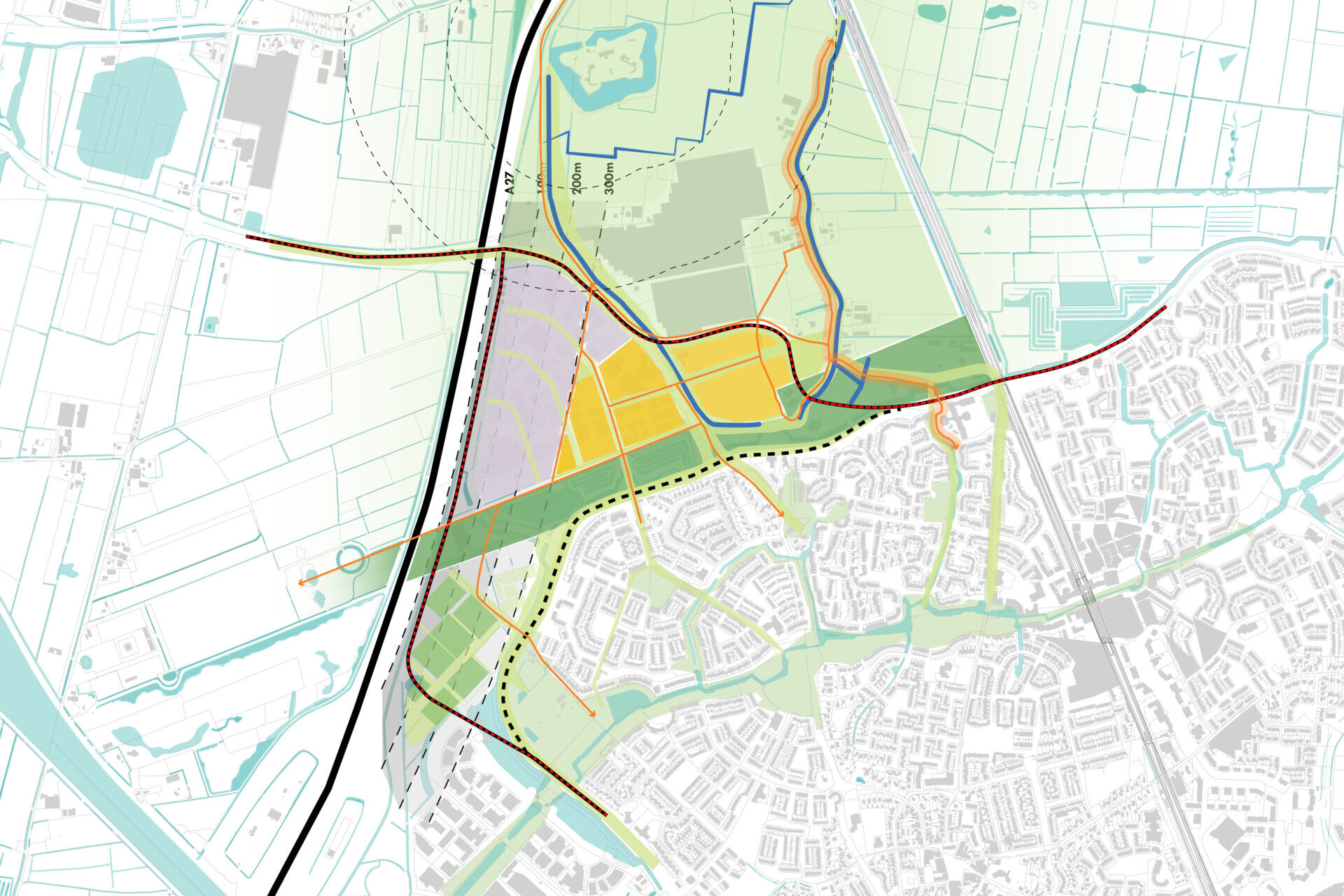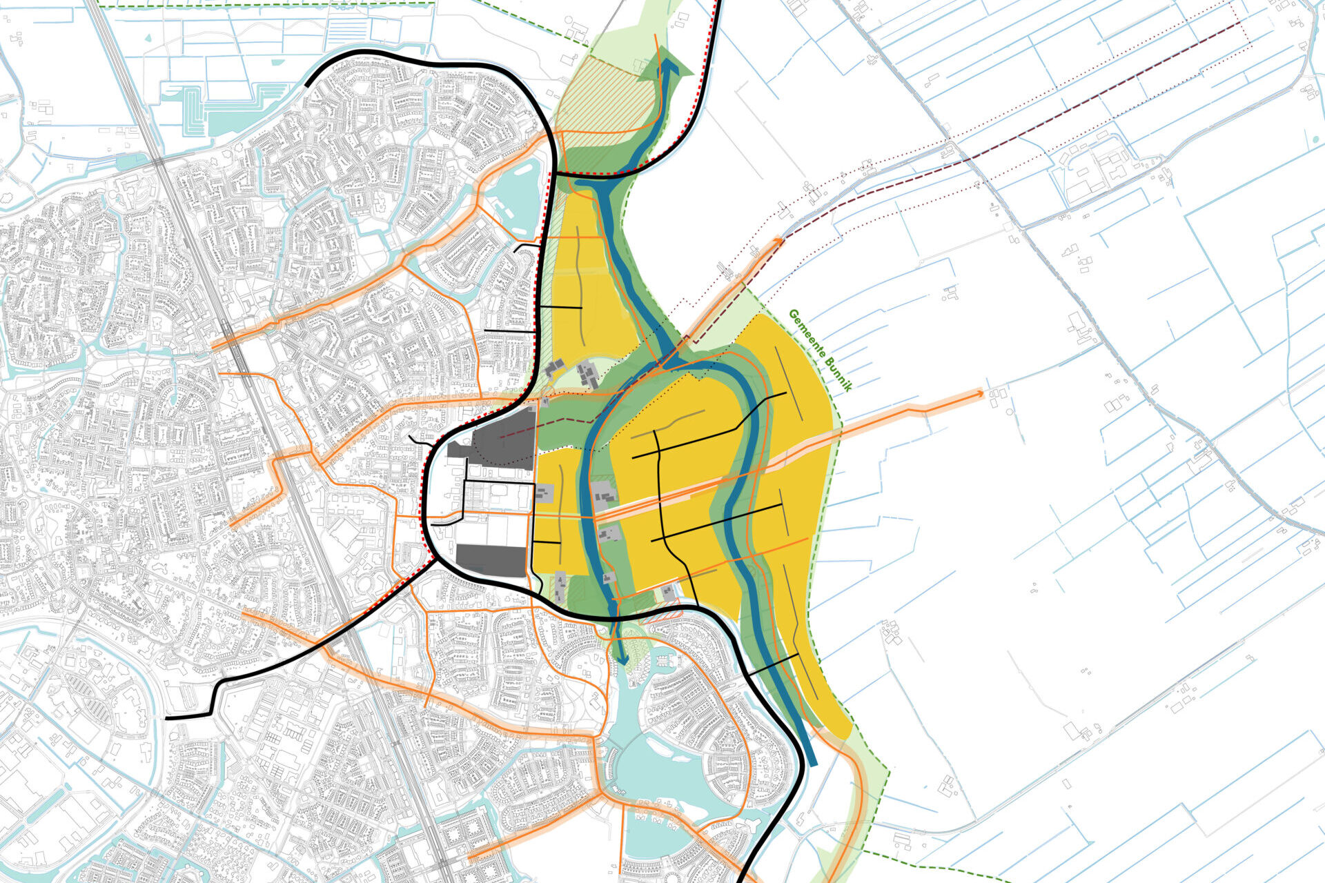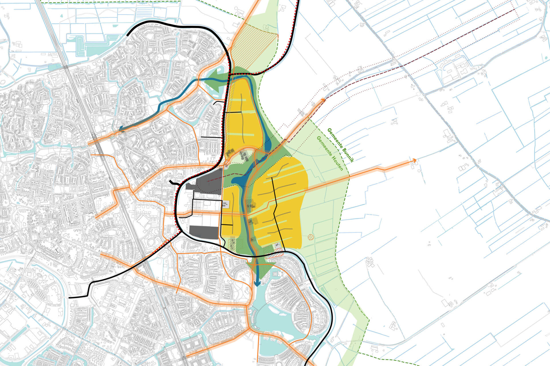 In de studie onderzochten we hoe de verdichting van bestaande stedelijke gebieden in balans kan worden gebracht met uitbreiding buiten de ring: óf naar het noordwesten – richting Utrecht – óf naar het oosten – waar het open landschap andere ruimtelijke kwaliteiten biedt.