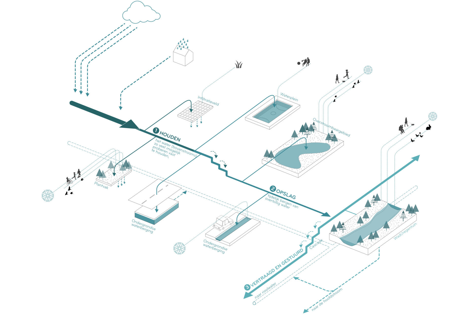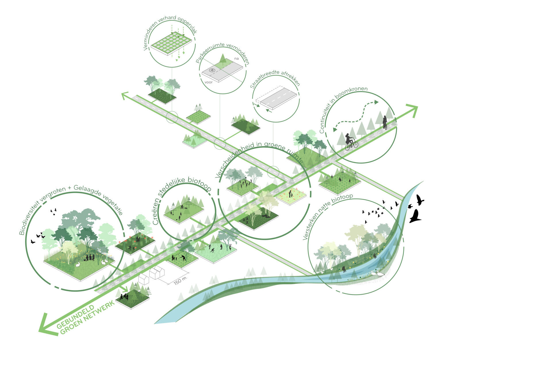 De meest integrale maatregelen bestaan uit herkenbare blauw-groene typologieën die voortbouwen op de historische en ruimtelijke kenmerken van het district. Ze bieden een oplossing voor de kernopgaven rondom overstroming, droogte, hitte, vergroening en ecologische netwerken. Tegelijkertijd versterken ze het stedelijk raamwerk door parken, naoorlogse hoofdwegen, voormalige beekcorridors en boomrijke woonstraten met elkaar te verbinden en de wijk een krachtige, groene identiteit te geven.