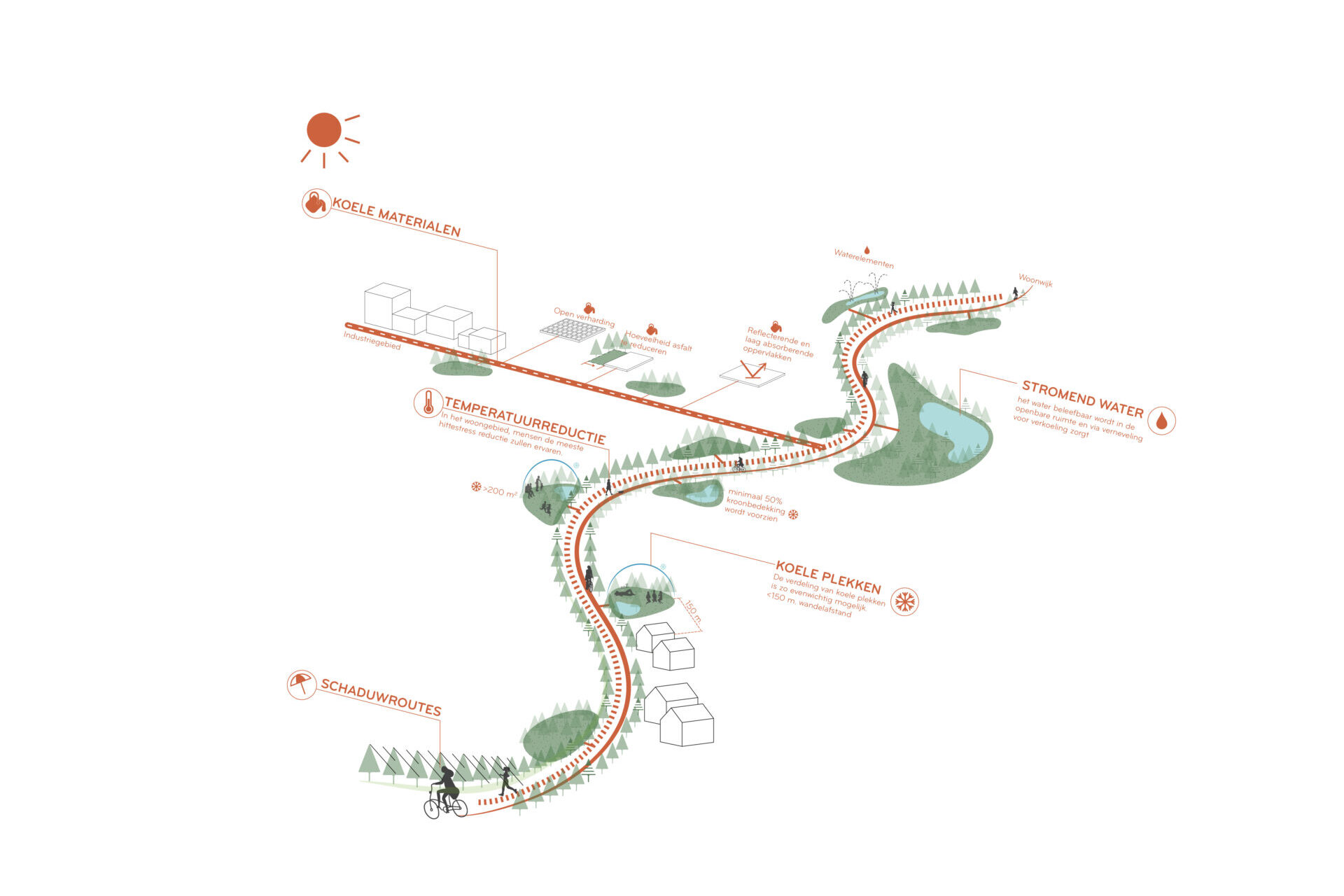 Het typische straatprofiel toont een overzicht van lokale maatregelen voor wateropvang, verkoeling en vergroening en maakt het eenvoudig om oplossingen te selecteren en strategisch te combineren. Door deze maatregelen op locatie samen te brengen ontstaan gerichte, afgestemde en meervoudig waardevolle, vier-in-één ruimtelijke interventies.