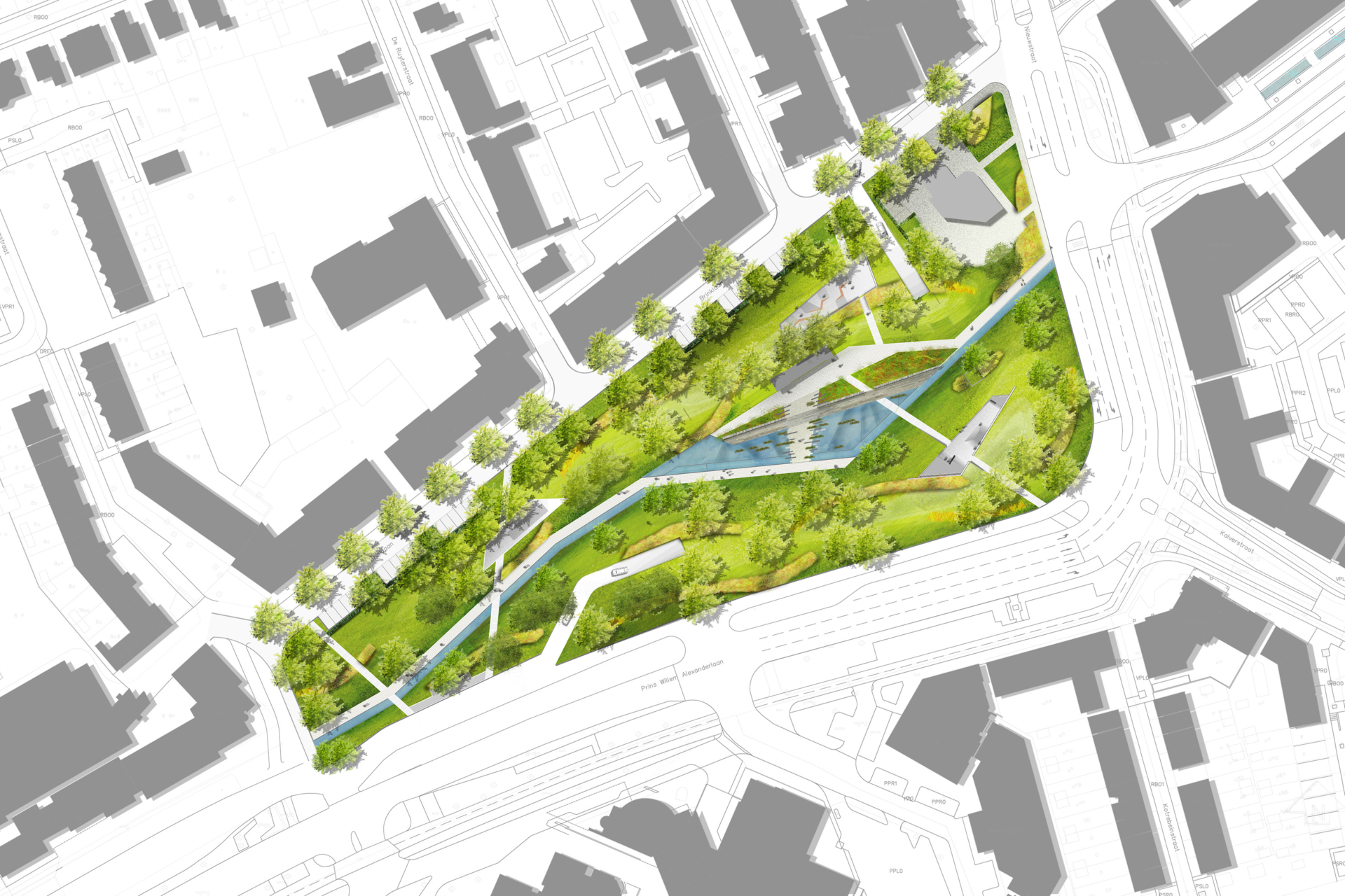 To celebrate the arrival of a true new park and affirm the city’s connection with the royal house, the Brink park was named the Catharina Amalia park, after the Dutch crown princess, in 2013. Apeldoorn has not only gained a city park, but its connection with the original landscape has been strengthened by presenting a crucial link in the system of streams in a prominent manner. For other cities, the combination of an underground car park, a park and a water system, is an example of how negative urban space can be transformed into a pleasant and meaningful green space.