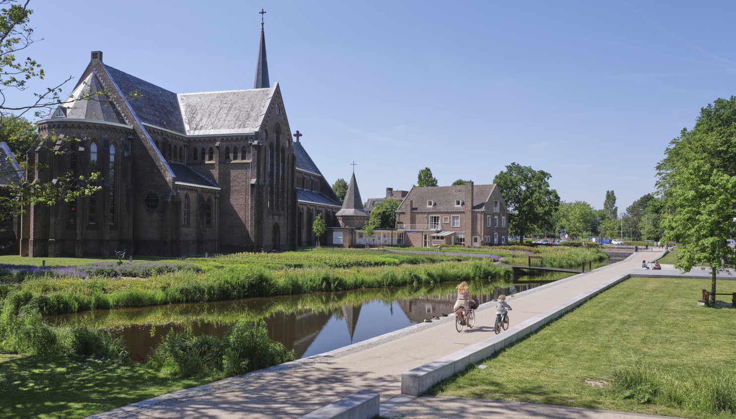 Additionally, wadis, nature-friendly banks, flower beds with bee and butterfly-friendly planting and bird-friendly shrubs and trees will further improve the biodiversity.. Thanks to the introduction of the water and new sight lines along the edge, a clearer and more striking transition has been made between the residential area and the central area. The monumental St. Martinus church has thereby acquired a more significant role in the park design. The surrounding area on the village side has a clearly designed character with contrasts and a graphic quality that mimics the bulb fields.